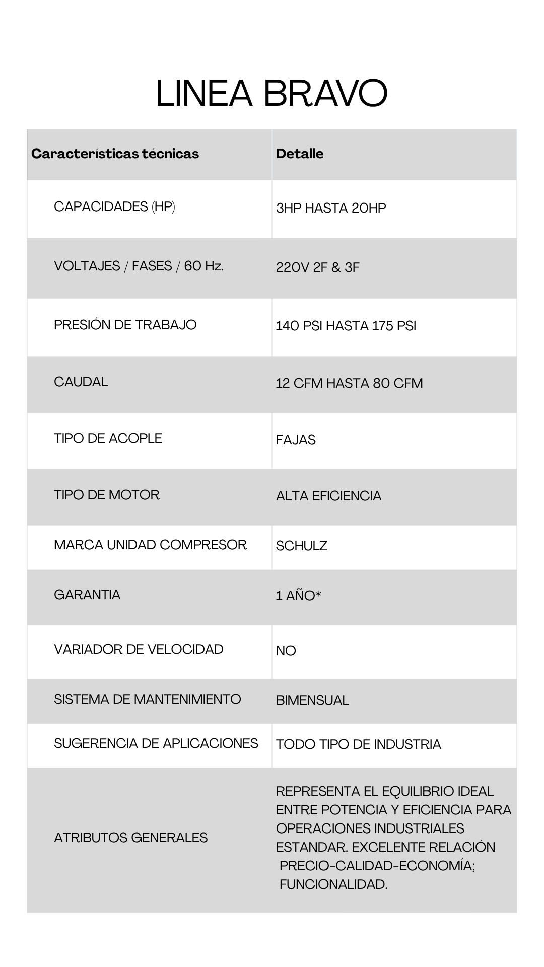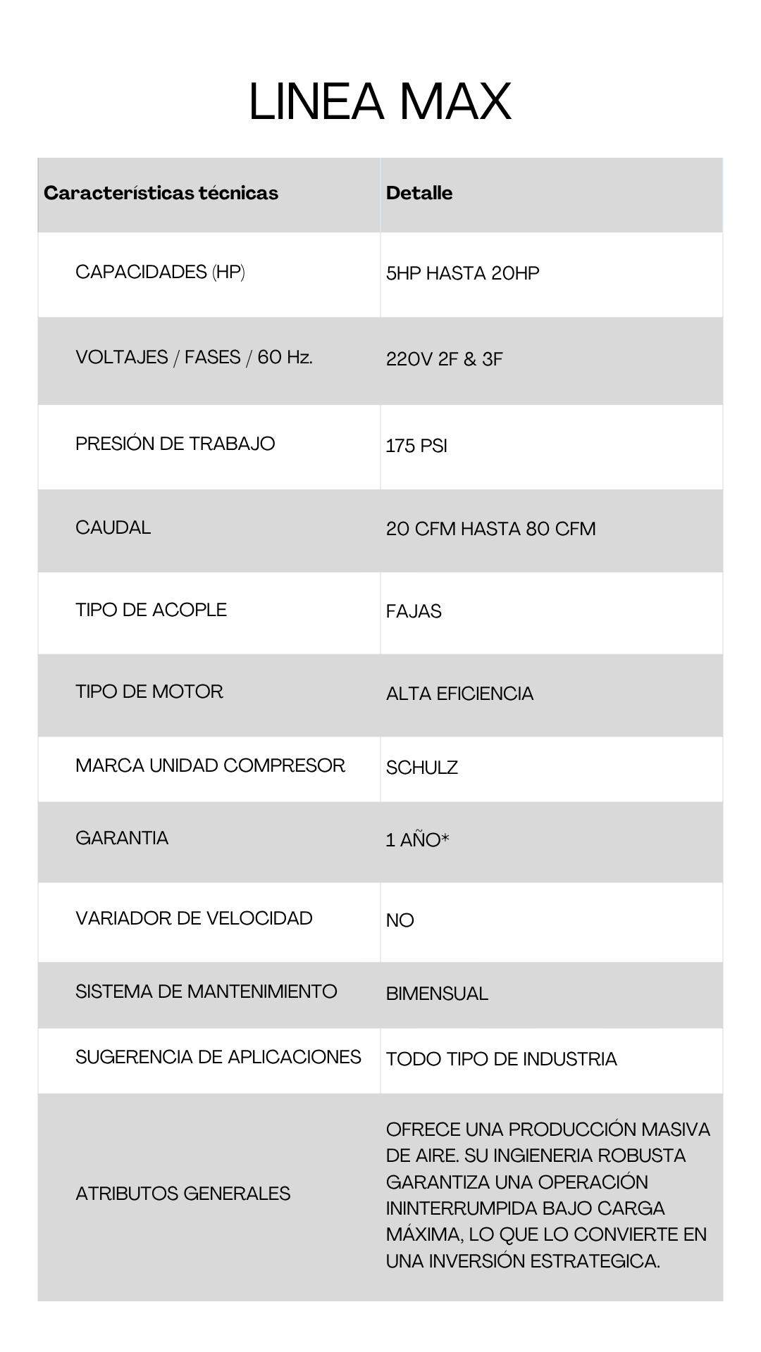Ideales para uso comercial e industrial. La línea de Schulz piston cuenta desde 3Hp hasta 20Hp con un motor de alta eficiencia. Excelente relación entre precio, economía, calidad, funcionalidad, robustez así como también confort y seguridad en aplicaciones medico-odontologicas