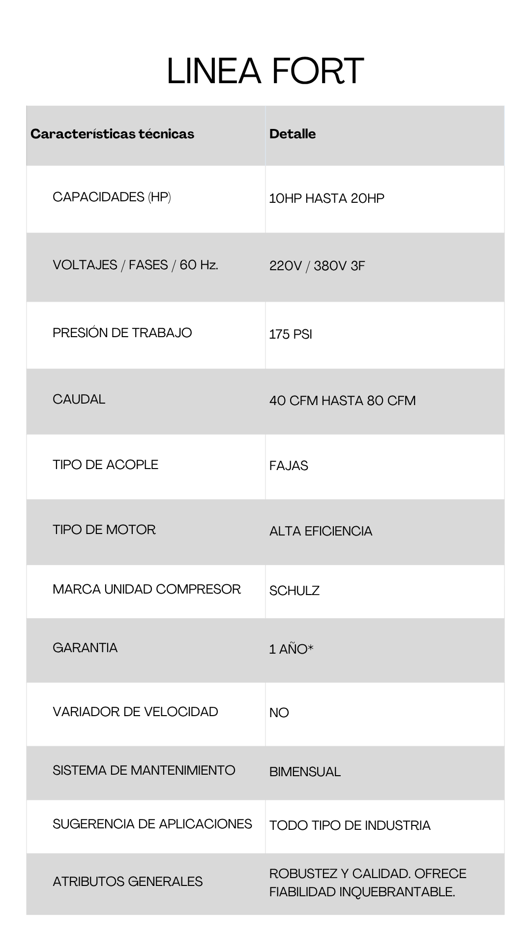 La robustez y calidad de la Línea Fort hacen de este compresor una tradición entre los productos de Schulz. La confianza comprobada después de muchos años de aplicación en diversas industrias hace a la Línea Fort el producto más robusto del mercado. Elija el mejor modelo para su necesidad.